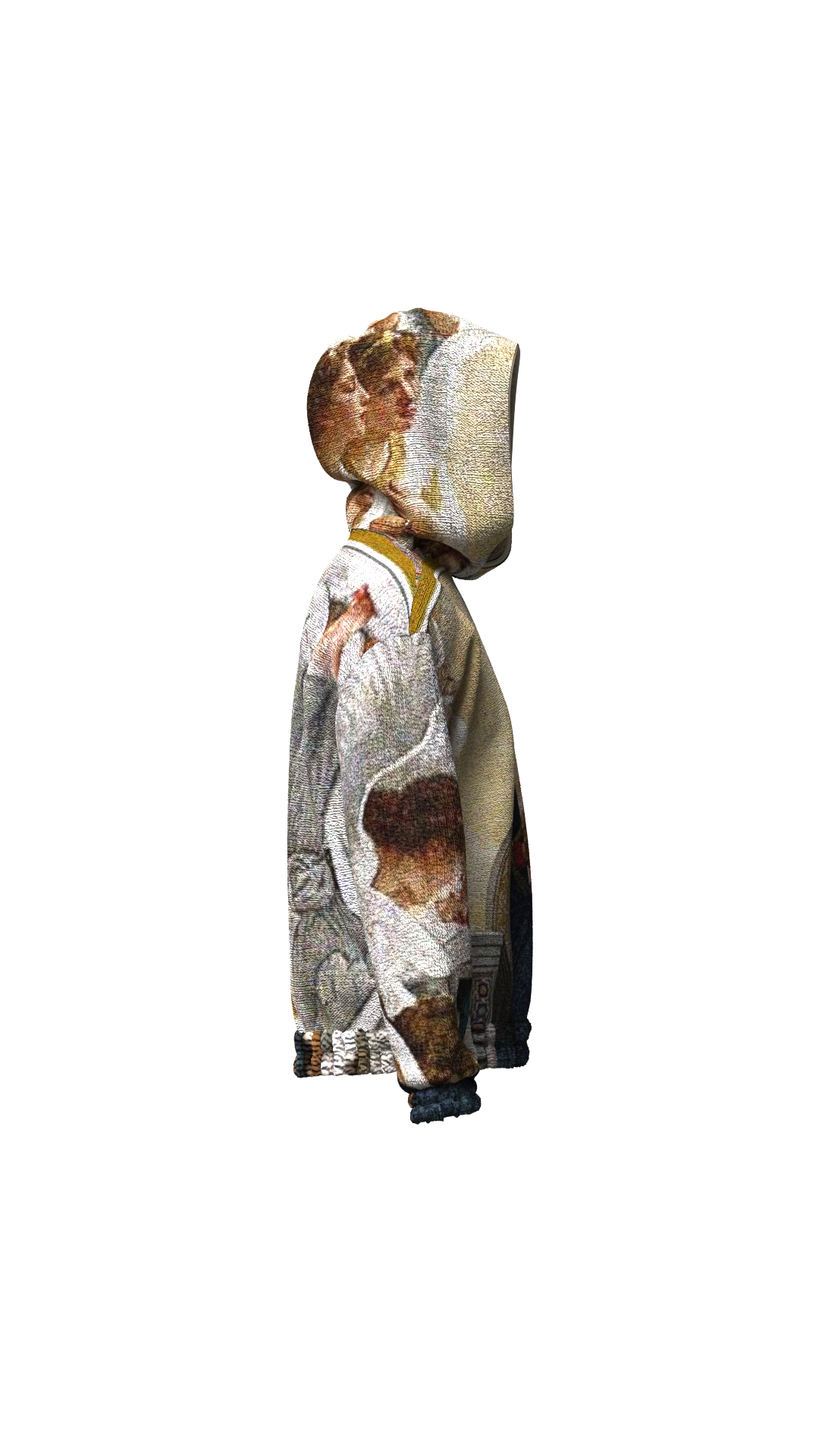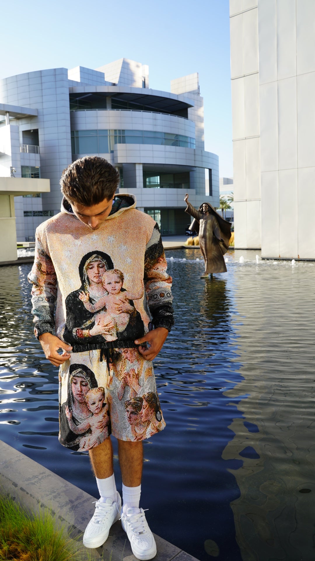 Sacred Crosses Virgin Mary Sacred Hoodie (Handmade) Embrace the divine with our stunning Virgin Mary Tapestry Hoodie, crafted with care and devotion. This 1/1 piece features a beautifully detailed tapestry of the Blessed Virgin Mary, intricately woven and hand-finished for a truly unique garment. Each hoodie is handmade, ensuring that every stitch is a testament to quality and craftsmanship. The rich tapestry design celebrates faith and style, making this hoodie both a bold fashion statement and a meaningful expression of reverence. Perfect for those who seek a blend of spiritual connection and contemporary comfort, this hoodie is ideal for layering in lukewarm weather or standing out in any crowd.
